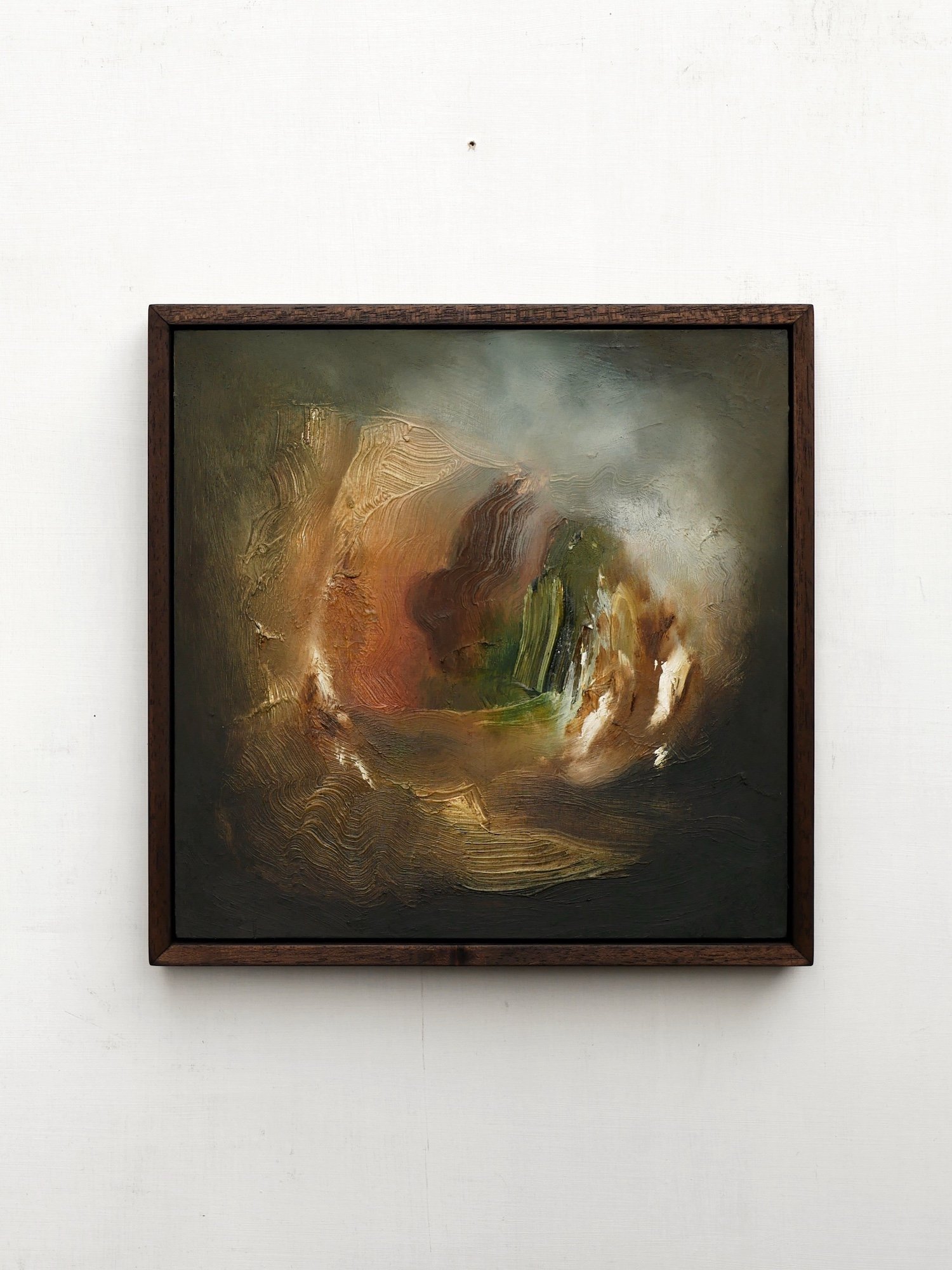 Framed in an obeche wood frame hand-stained with traditional walnut stain.